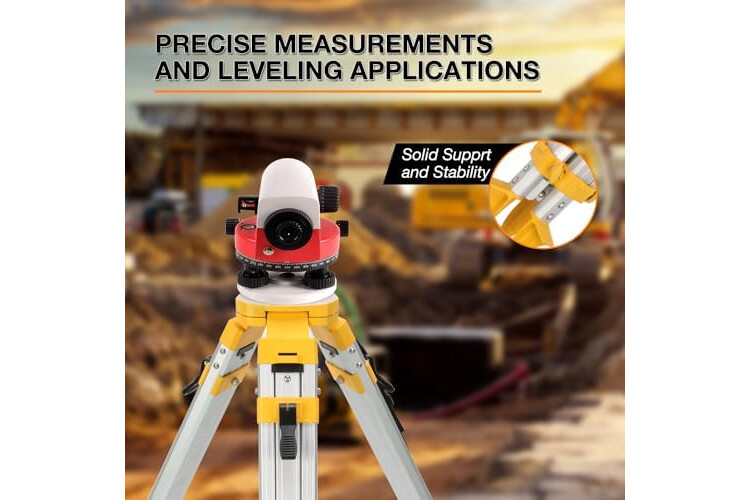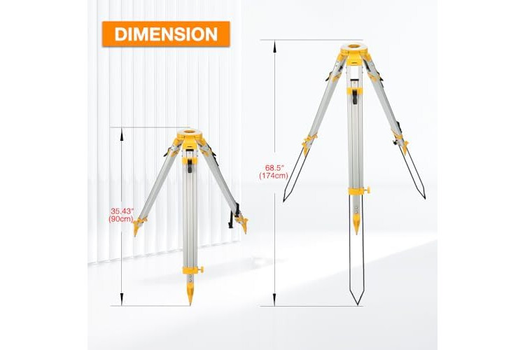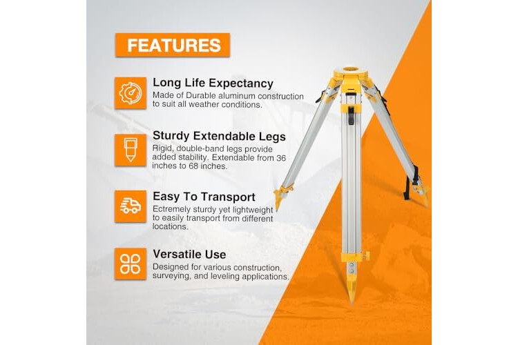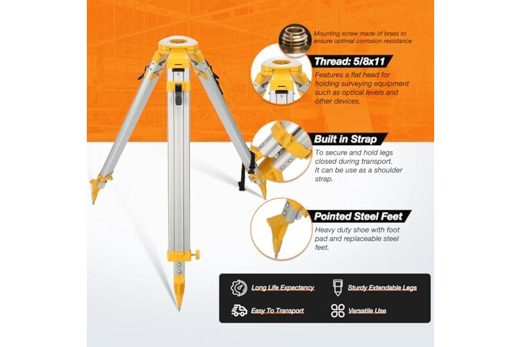 STURDY, DURABLE CONSTRUCTION: Surveying Tripod Suitable for construction conditions, expertly crafted of durable aluminum to provide long-term durability and use for years to come. Rigid, double-banded legs provide added stability, while the specially designed metallic feet with points offer a stable tripod on wet, soft, hard and uneven ground.