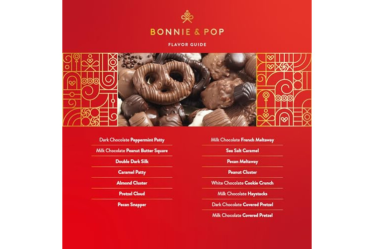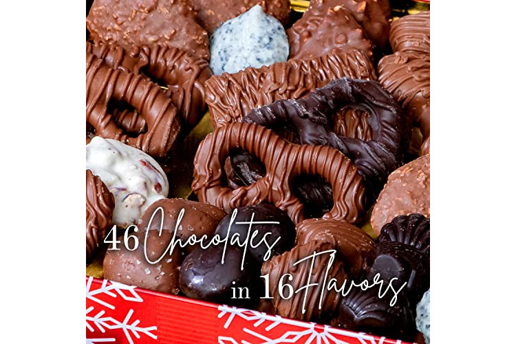 Overflowing With Holiday Favorites: Indulge in over 2 pounds of: Peppermint Patties, Milk PB Squares, English Toffee, Almond Clusters, Pretzel Clouds, Pecan Snappers, Sea Salt Caramels, Pecan Meltaway, Milk Cashew Clusters, decadent drizzled chocolate pretzels and more; each treat is individually wrapped for freshness and delight.