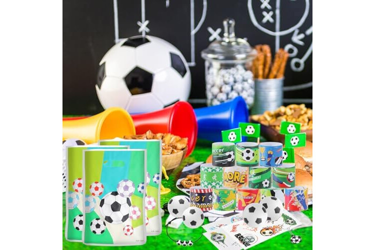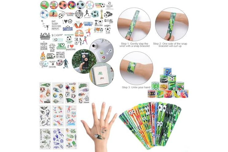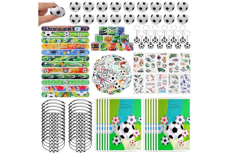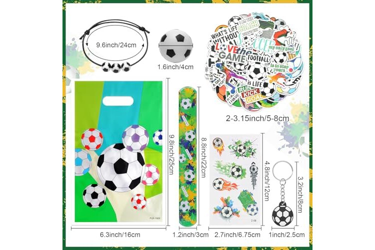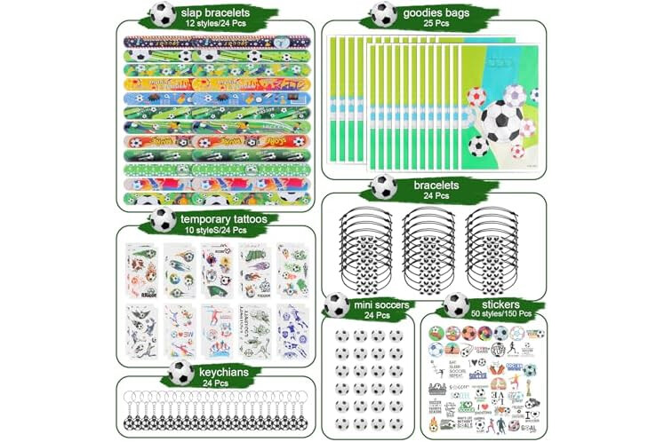 Soccer party favors set: there are a total of 294 pieces of soccer party supplies, including 24 sheets of soccer temporary tattoos, 24 mini soccers, 24 soccer slap bracelets, 24 soccer keychains, 24 soccer gift bags, 24 soccer bracelet and 150 soccer stickers, different items with adequate quantity to satisfy your diverse and soccer party using, decorating and sharing needs