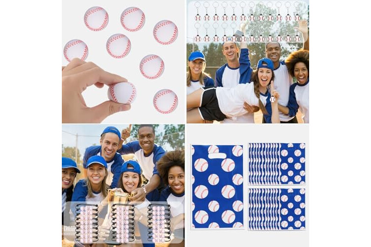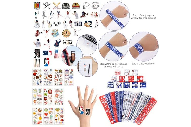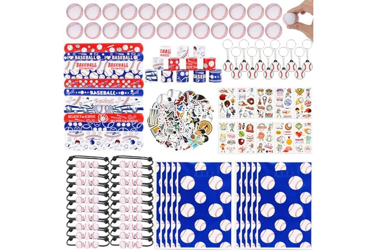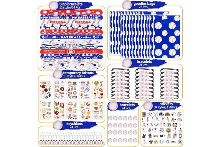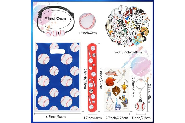 Baseball party favors set: there are a total of 294 pieces of baseball party supplies, including 24 sheets of baseball temporary tattoos, 24 mini baseballs, 24 baseball slap bracelets, 24 baseball keychains, 24 baseball gift bags, 24 baseball bracelet and 150 baseball stickers, different items with adequate quantity to satisfy your diverse and baseball party using, decorating and sharing needs