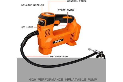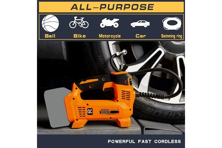 CONVENIENT INFLATOR: Compatible with DEWALT 20V Max powerstack batteries. Just plug in your own DEWALT batteries on our tire inflator. Equipped with different air nozzles,The tire pump has a wider applying range to cover various needs for inflatables such as vehicle tires and sports or entertainment equipment including compact or midsize Sedan, SUV, ATV, bike, motorcycles, air mattress, inflatable boats, balls.You can spend more time having fun and less time trying to solve problems.