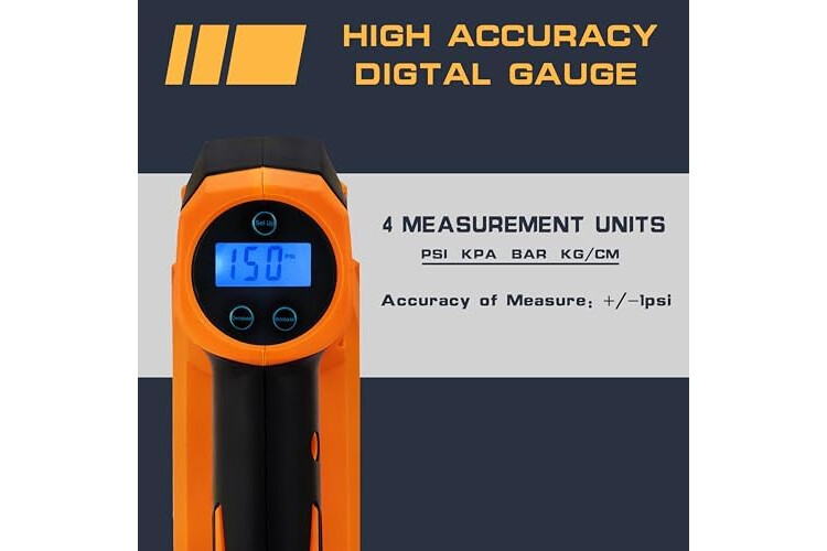 AUTO-STOP WITH SMART MONITOR: The portable tire inflator back-lit LCD screen will display both the desired tire pressure value and the current tire pressure. With maximum pressure 150 PSI and auto-stop give you smart inflation. No need to worry about over-inflating your tire, it will automatically shut off when the pressure has been reac...