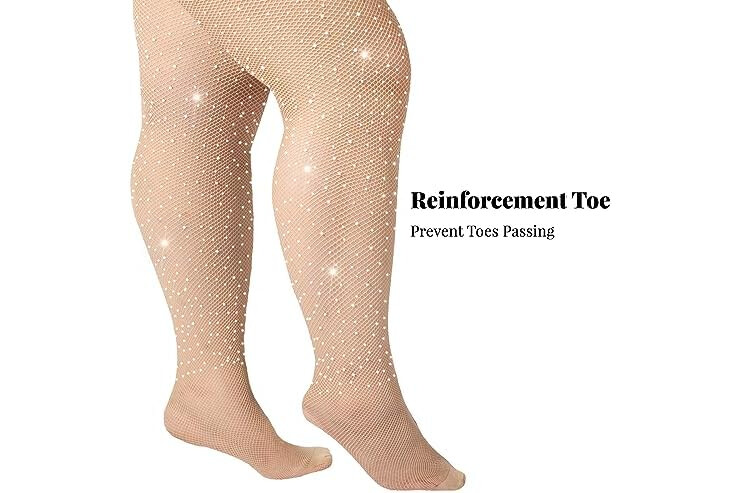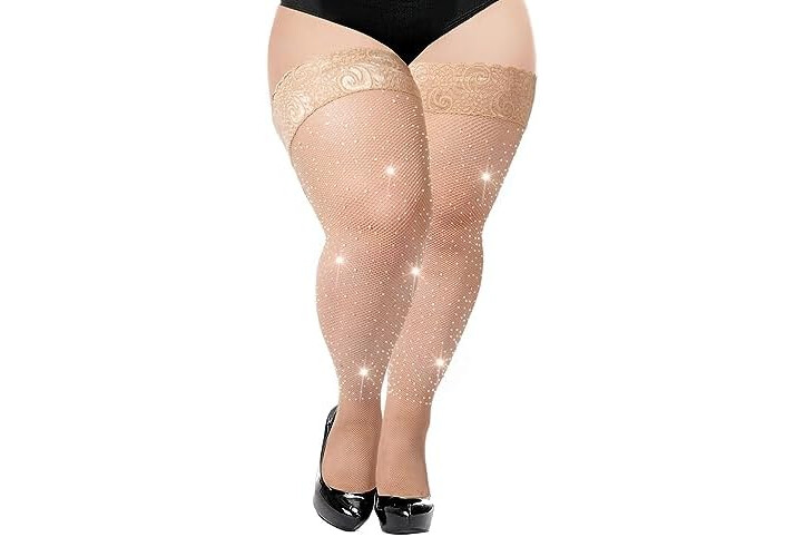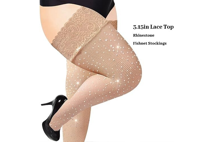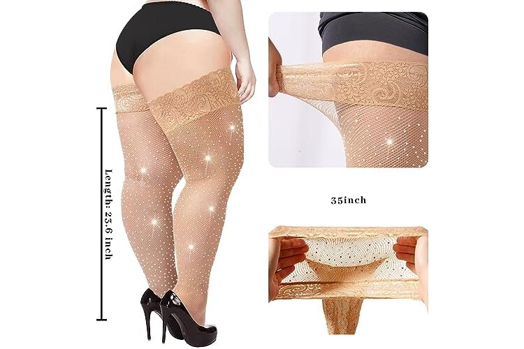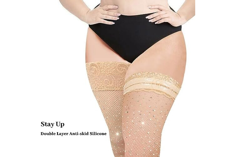 Moon Wood Plus Size Fishnet Stockings for Women Sparkling Rhinestone Fishnets Silicone Lace Top Stay Up Lingerie Thigh Highs