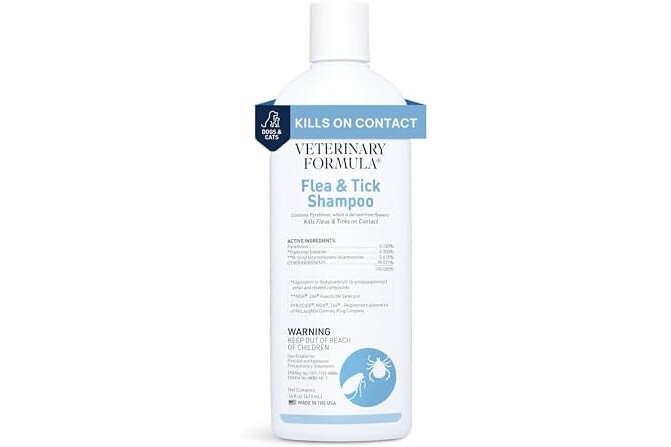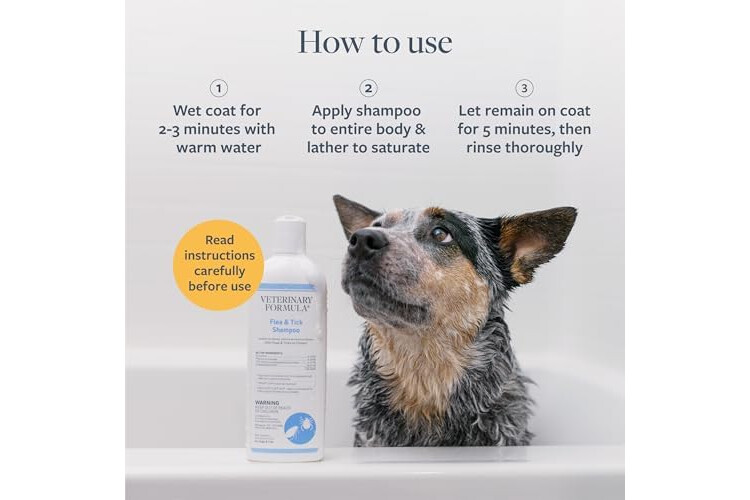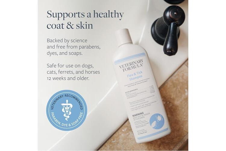 Veterinary Formula Flea and Tick Shampoo is formulated with Pyrethrum, a natural insecticide, to immediately kill and control fleas and ticks. Made with Aloe Vera and Lanolin, it soothes irritations from flea and tick bites, while also gently cleansing and exfoliating your pet’s skin and coat. Pyrethrum, made from a flower, is the active ingredient in our 16 oz. bottle of Flea and Tick Dog and Cat Shampoo. Pet parents should look for droppings/flea dirt in the dog’s coat, allergic dermatitis, excessive scratching, licking or biting at skin, hair loss, tapeworms, and pale gums from flea and tick bites. This Flea and Tick Shampoo is paraben and soap-free. It contains no harsh soaps or damaging detergents, only naturally derived cleansers that are pH balanced for your pet’s skin. For best results, follow the instructions on the product packaging carefully. Wear rubber gloves when applying Flea and Tick Shampoo for dogs and cats. When shampooing your dog, avoid eyes. Use a cloth or sponge to shampoo around your dog’s eyes. Thoroughly wet the entire coat with warm water and then apply enough shampoo to make a lather and work thoroughly into the coat. For maximum control, allow the lather to remain in contact with the skin for five to ten minutes before rinsing. Do not reapply the product for 7 days. Flea and Tick shampoo is safe for dogs, cats, ferrets, and horses 12 weeks and older. We know that your dogs and cats are more than just pets - they are part of the family - so Veterinary Formula Clinical Care develops premium products that pet parents can actually afford. Your pet will be free of fleas and ticks, smell great and have a soft, shiny, and lustrous coat – making you both happy and able to focus on more important things like treats, games, and snuggles.