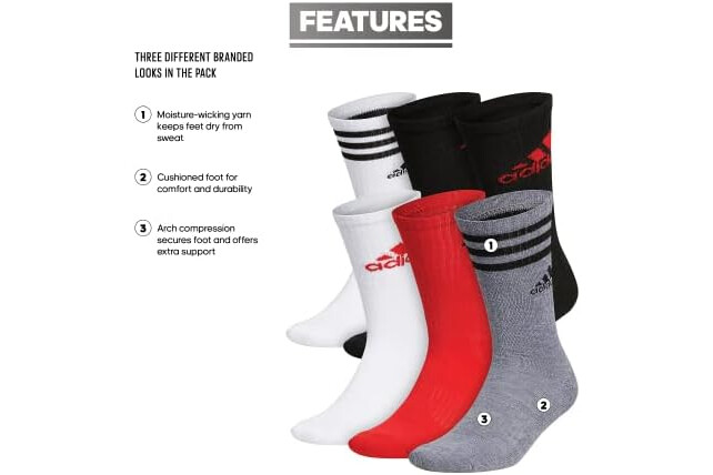 adidas Men's Athletic Cushioned 6-Pack Crew, Cushioned Crew Socks with Arch Compression for a Secure Fit