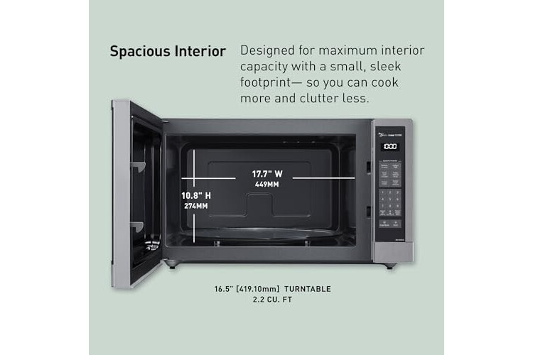 LARGE FAMILY SIZE: This countertop microwave with 16. 5-inch turntable is thinner, lighter and more efficient, allowing you to devote less space to electronics and more to interior capacity; internal dimensions (H x W x D): 10-15/16-inch x 18-7/16-inch x 18-1/2-inch