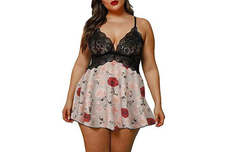 XAKALAKA Women Plus Size Lingerie Lace V Neck Babydoll Strap Chemise Sleepwear Nightie