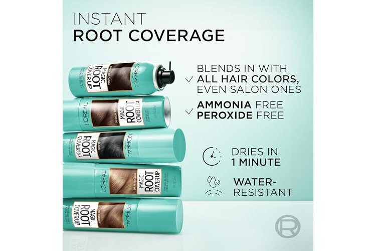 Temporary root Cover Spray- conceals grays in seconds for flawless roots -get seamless coverage with our lightweight formula that leaves no smudging or sticky residue when dry, and that's ammonia and peroxide free