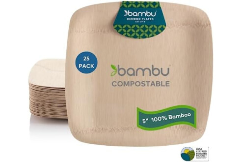 Bambu Pack of 25 - 5 Inch Disposable Bamboo Plates Square, Biodegradable Eco Friendly Products, Bamboo Disposable Appetizer Plates for Events