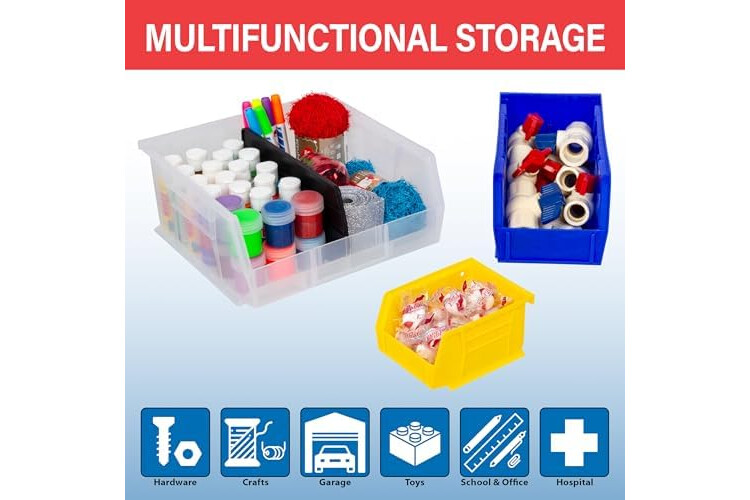 DURABLE ORGANIZATION: Crafted from heavy-duty, one-piece industrial plastic, these bins are rust, water, and corrosion-proof; Reinforced side ribs add strength and prevent spreading; Each storage bin is easy-to-clean and can be used indoors or outdoors