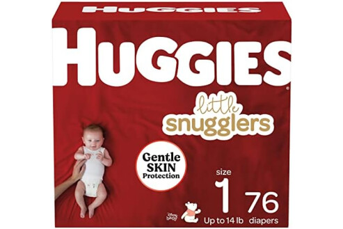 Huggies Little Snugglers baby diapers size 1 fit babies up to 14 lb. (6 kg); designed for gentle skin protection; packaging may vary from image shown