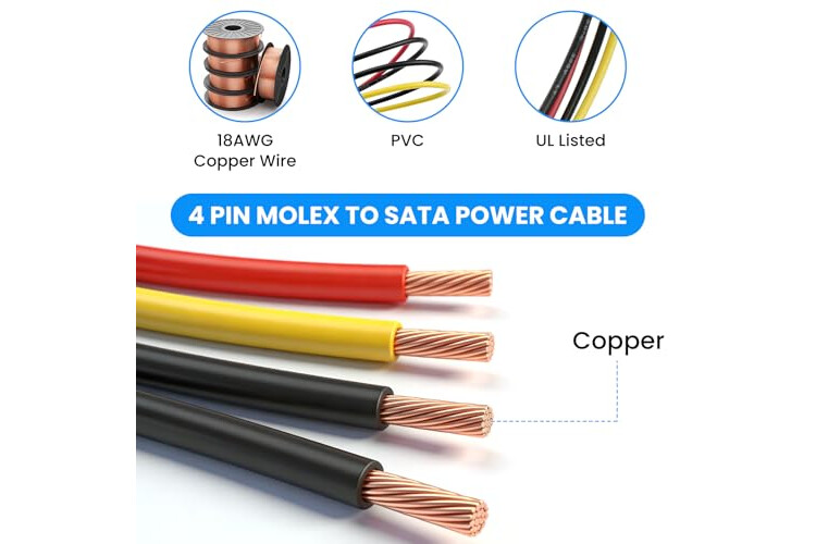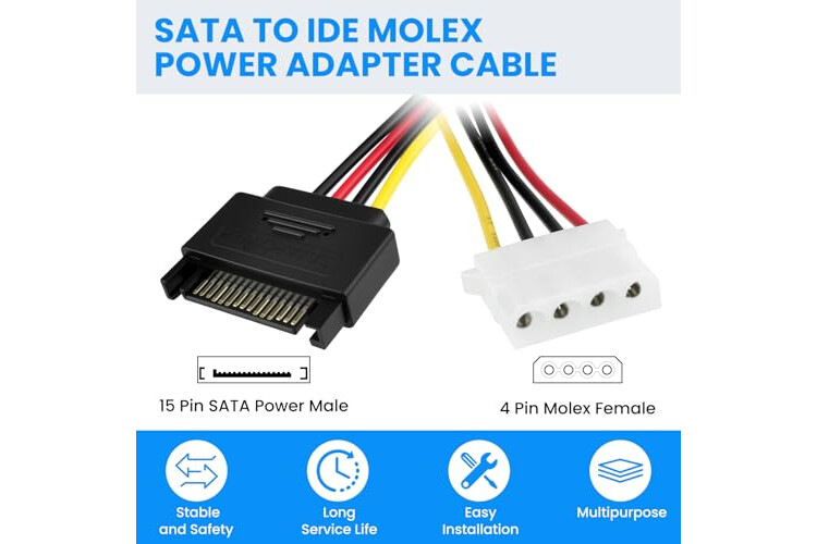 • SATA to IDE Molex Power Adapter Cable, used to convert 15pin SATA male to 4pin Molex female for connection to legacy optical drives.