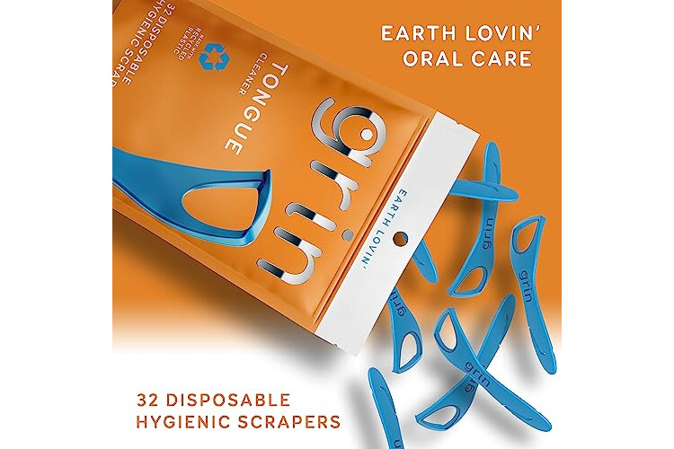GRIN Tongue Cleaner, 32 Count, Disposable Tongue Cleaner, Hygienic Scraper, Recycled Plastic, Clean Tongue, Promote Fresh Breath, Includes Safe Fold- Back Tooth Pick (Pack of 3)