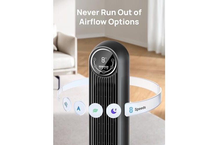 Dreo Tower Fan for Bedroom, 2026 Upgraded DC Motor, 28ft/s High Velocity, 20dB Ultra Quiet Standing Fan, 8 Speeds 4 Modes, 90ยฐ Oscillating Bladeless Fan for Indoors, Floor Fans with Remote, Black