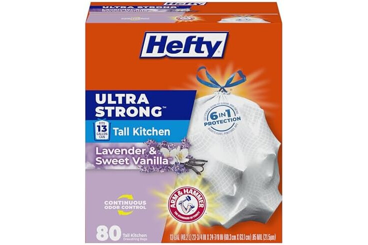 13 Gallon Tall Kitchen Garbage Bags: This package contains 80 Hefty Ultra Strong 13 Gallon Kitchen Trash Bags in White, Lavender and Sweet Vanilla scent