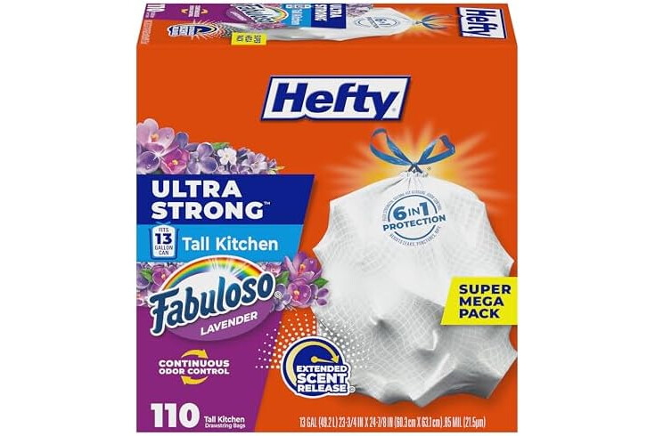 Hefty Ultra Strong 13 Gallon Trash Bags, Tall Kitchen Trash Bags 13 Gallon Size, Resist Leaks, Punctures, and Rips, Continuous Odor Control, White, Fabuloso Lavender Scent, 110 Bags