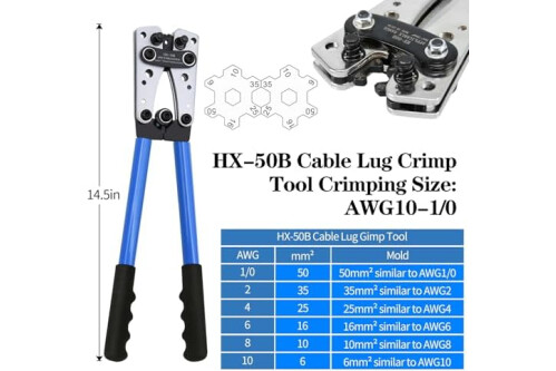 【Rotary Crimping Mold】- The cable lug crimping tool is available in 6 crimping sizes: AWG 10, 8, 6, 4, 2 and 1/0 (similar to 6mm²/10mm²/16mm²/25mm²/35mm²/50mm²).
