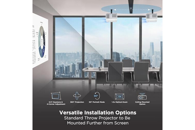 Easy Setup & Image Adjustment: Features 1.3x optical zoom, 0.8x-2.0x digital zoom, H/V keystone, 360-degree projection, portrait mode, and 4-corner adjustment