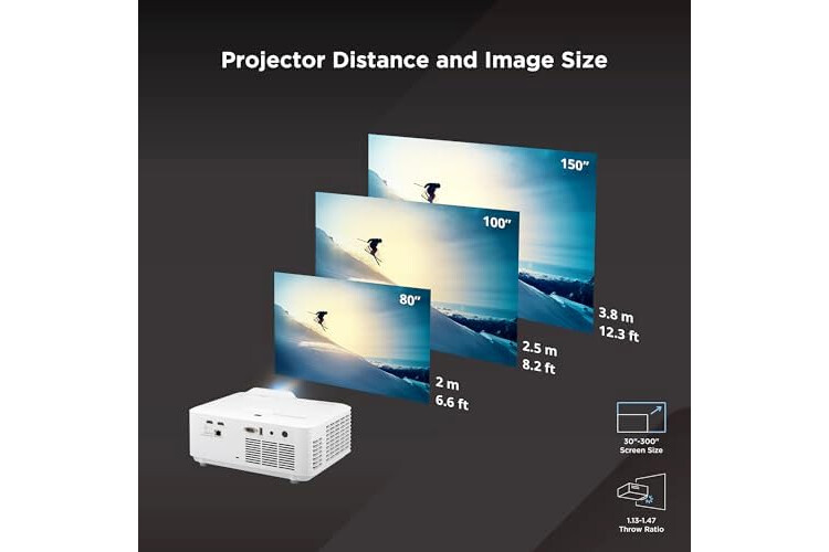 Large Screen Projection: Projects screen sizes from 80" to 150" with a throw distance of 6.6 ft - 12.3 ft; displays a 100" image from 8.2 ft