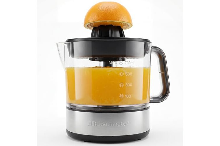 Elite Gourmet ETS623 BPA-Free 40-Watt Electric Citrus Juicer, Compact, Large Volume, Pulp Control, Oranges, Lemons, Limes, Grapefruits with Easy Pour Spout, 24oz, Black/Stainless Steel