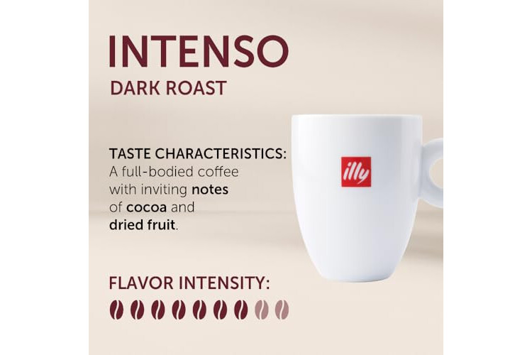 ILLY DISTINCTIVE TASTE - Intenso, dark roast flavored ground coffee is a bold roast and has a pleasantly robust finish with warm notes of cocoa and dried fruit.