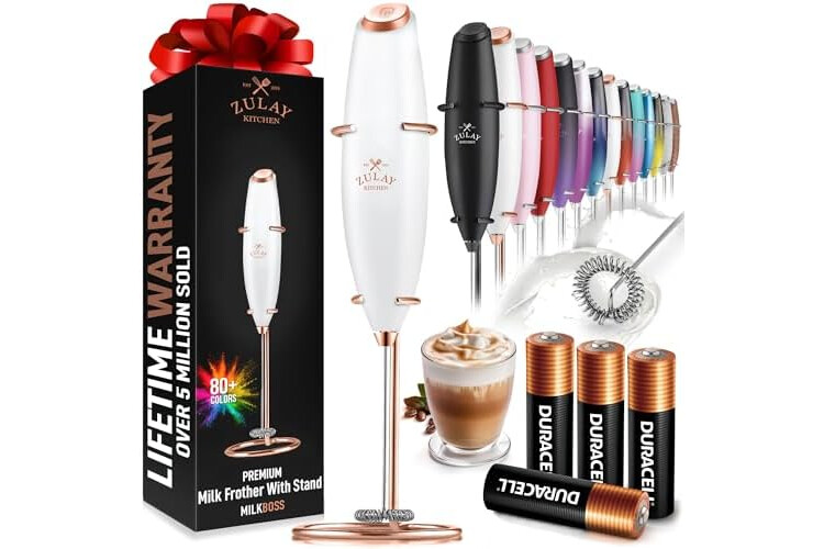 Zulay Kitchen Powerful Milk Frother Wand With 4 AA Duracell Batteries - Ultra Fast Handheld Drink Mixer - Electric Whisk Foam Maker for Coffee, Lattes, Cappuccino, Matcha & Creamer - White & Rose Gold