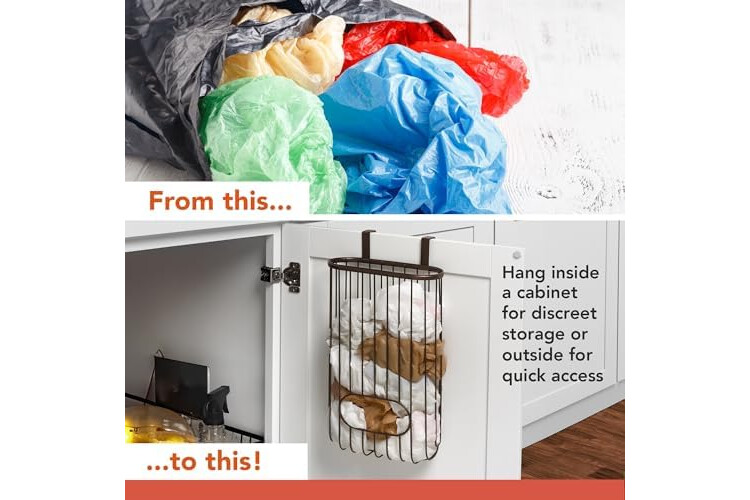 HOLDS GROCERY BAGS FOR RECYCLING: Reduce, reuse, recycle! Store your old plastic grocery bags so you can reuse them. This organizer keeps grocery bags together and slides over cabinet doors or drawers to keep bags out of the way yet within easy reach.