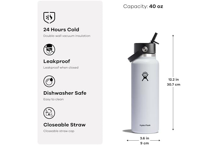 24 HOURS COLD: The insulated bottle keeps drinks cold for 24 hours thanks to double-wall vacuum insulation. Hydro Flask water bottles feature TempShield insulation, designed to be lightweight and efficient temperature retention, keeping contents chilled all day. Flex Straw Cap not intended for use with hot drinks.