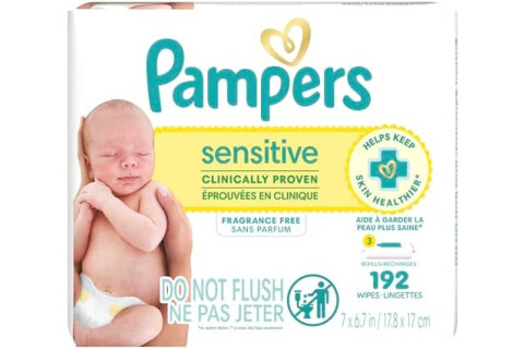 Pampers Baby Wipes Sensitive, Water Based Wipes, Hypoallergenic and Unscented Wipes, 192 Wipes Total (3 Refill Packs)