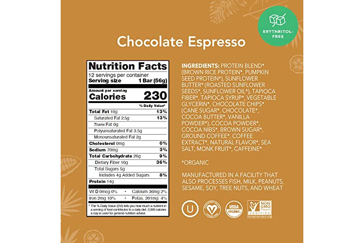 Box contains 12 - 1.98 ounce USDA Organic Chocolate Espresso Plant Based Protein Bars