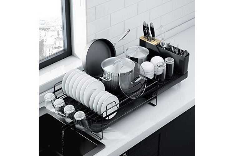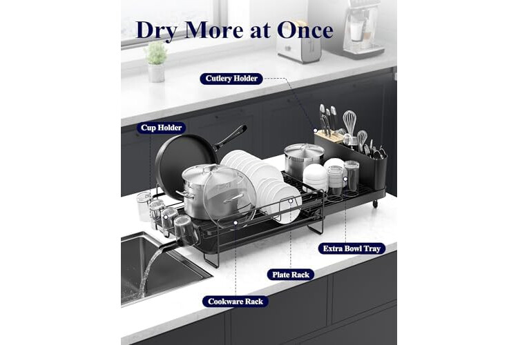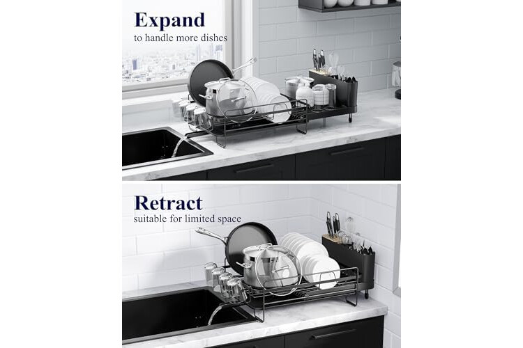 Kitsure Large Dish Drying Rack - Extendable Dish Rack, Multifunctional Dish Rack for Kitchen Counter, Anti-Rust Dish Drainers with Cutlery & Cup Holders 19.2"-26.7" L x 12.9" W, Black