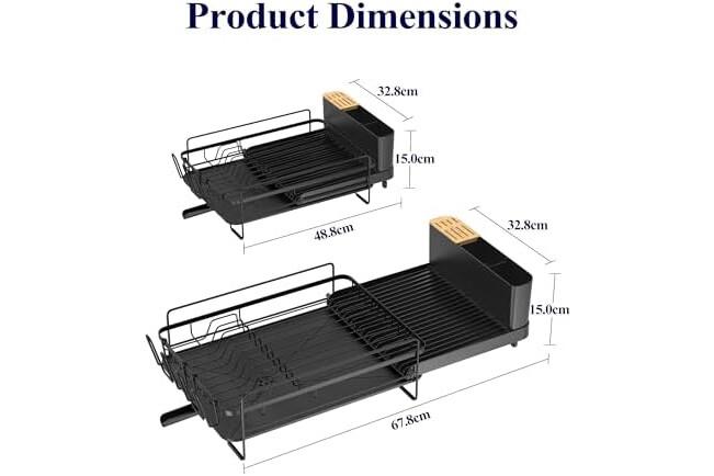 EXTENDABLE RACK: Kitsure kitchen dish drying rack with an extendable design can be adjusted to fit different kitchens. It measures 19.2" to 26.7" in length, and from 12.9" W *7.2" H . Please choose the appropriate size according to the length of your kitchen countertop.