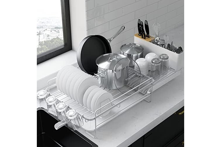 Kitsure Large Dish Drying Rack - Extendable Dish Rack, Multifunctional Dish Rack for Kitchen Counter, Anti-Rust Dish Drainers with Cutlery & Cup Holders 19.2"-26.7" L x 12.9" W, White