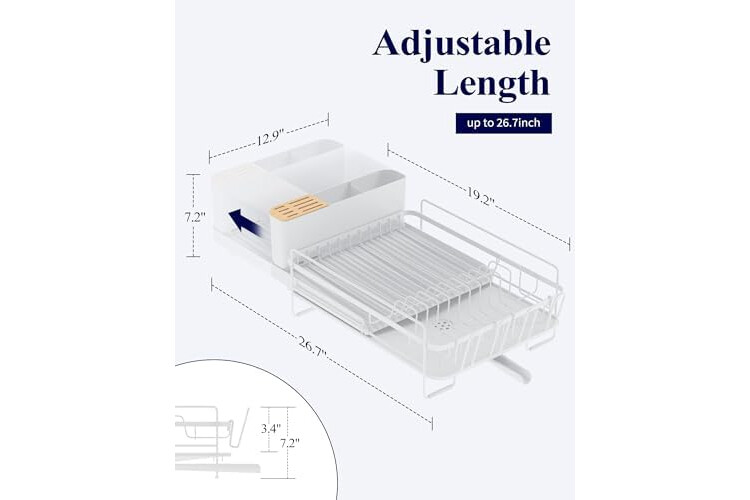EXTENDABLE RACK: Kitsure kitchen dish drying rack with an extendable design can be adjusted to fit different kitchens. It measures 19.2" to 26.7" in length, and from 12.9" W *7.2" H . Please choose the appropriate size according to the length of your kitchen countertop.