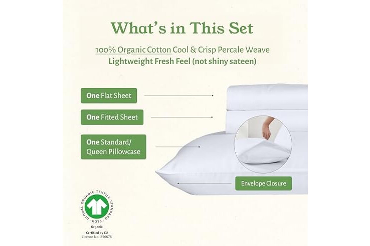 OUR SHEET SET HAS EARNED THE GOOD HOUSEKEEPING SEAL (GOTS Certified 100% Organic Cotton Sheet Set): Classic Percale Sheets. Gentle on skin, this twin sheets set is made using 100% organic cotton percale fabric and offers a balance of crispness and breathability. These durable bed sheets have a beautiful matte finish and a crisp touch. Independently tested to earn the prestigious Good Housekeeping Seal.