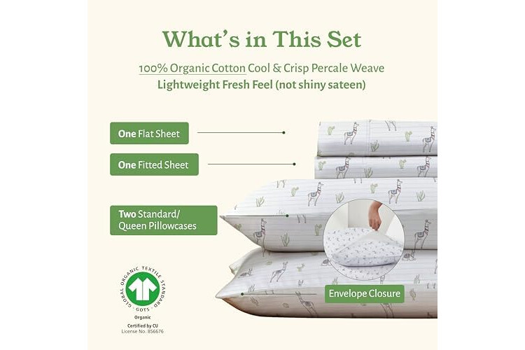 OUR SHEET SET HAS EARNED THE GOOD HOUSEKEEPING SEAL (NATURE-INSPIRED ELEGANCE): Immerse yourself in luxurious comfort with our 100% Organic Cotton Llama Printed Sheet Set. This organic sheets set is adorned with a delightful print inspired by nature's beauty. This organic cotton percale fabric is soft, yet crisp. Independently tested to earn the prestigious Good Housekeeping Seal.