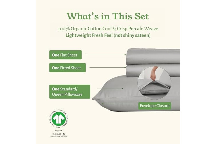 OUR SHEET SET HAS EARNED THE GOOD HOUSEKEEPING SEAL (GOTS Certified 100% Organic Cotton Sheet Set): Classic Percale Sheets. Gentle on skin, this twin bed sheets set is made using 100% organic cotton percale fabric and offers a balance of crispness and breathability. These durable bed sheets have a beautiful matte finish and a crisp touch. Independently tested to earn the prestigious Good Housekeeping Seal.