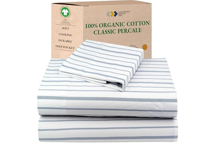 California Design Den Blue Stripe Sheets, 100% Organic Cotton Percale Sheets, Deep Pocket Twin XL Sheets & Pillowcase Set - Blue Stripe
