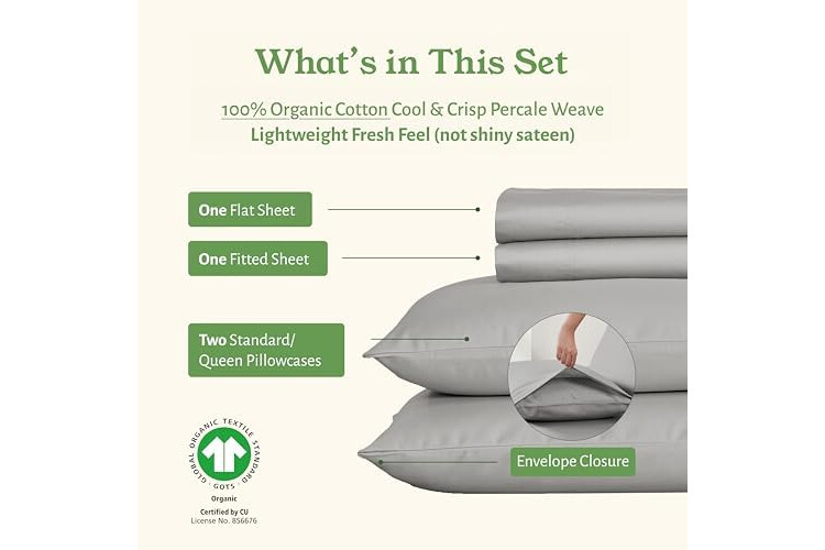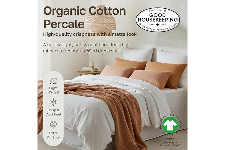 OUR SHEET SET HAS EARNED THE GOOD HOUSEKEEPING SEAL (GOTS Certified 100% Organic Cotton Sheet Set): Classic Percale Sheets. Gentle on skin, this queen bed sheets are made using 100% organic cotton percale fabric and offers a balance of crispness and breathability. These durable bed sheets have a beautiful matte finish and a crisp touch. Independently tested to earn the prestigious Good Housekeeping Seal.