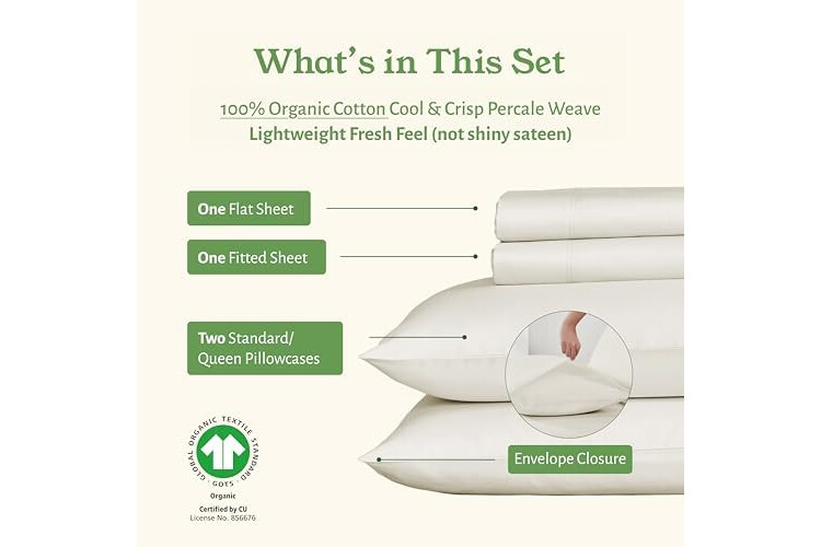 OUR SHEET SET HAS EARNED THE GOOD HOUSEKEEPING SEAL (GOTS Certified 100% Organic Cotton Sheet Set): Classic Percale Sheets. Gentle on skin, this queen bed set is made using 100% organic cotton percale fabric and offers a balance of crispness and breathability. These durable bed sheets have a beautiful matte finish and a crisp touch. Independently tested to earn the prestigious Good Housekeeping Seal.