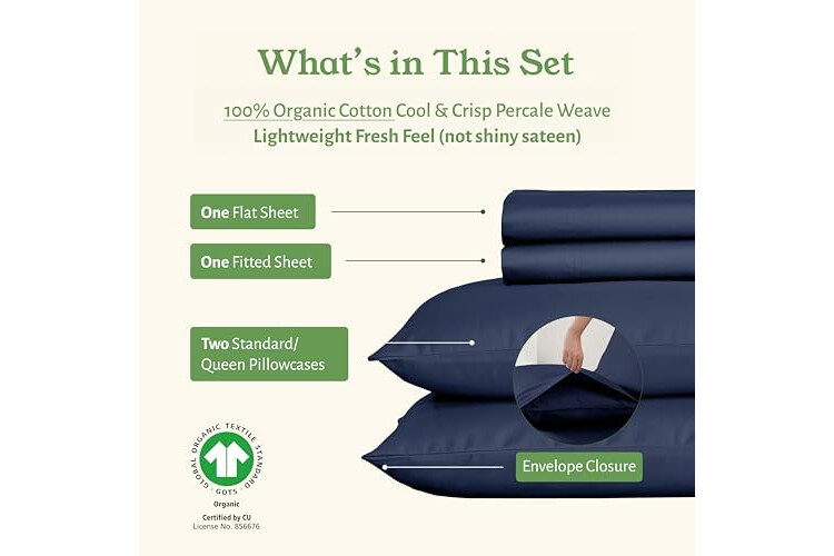 OUR SHEET SET HAS EARNED THE GOOD HOUSEKEEPING SEAL (GOTS Certified 100% Organic Cotton Sheet Set): Classic Percale Sheets. Gentle on skin, this queen size bed sheets set is made using 100% organic cotton percale fabric and offers a balance of crispness and breathability. These durable bed sheets have a beautiful matte finish and a crisp touch. Independently tested to earn the prestigious Good Housekeeping Seal.
