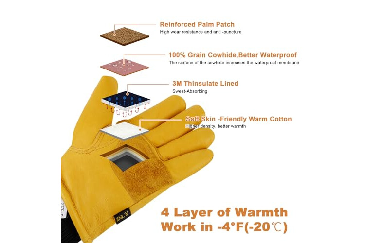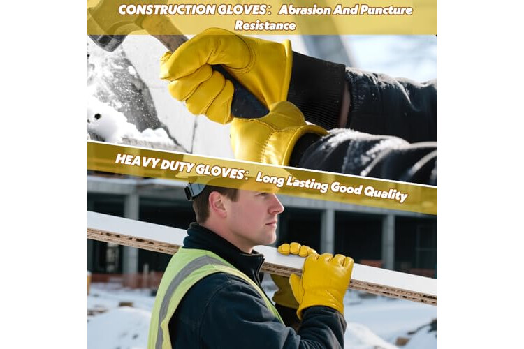 DLY Winter Work Gloves for Men, Insulated, Puncture and Abrasion Resistant, Cowhide Leather with Warm Thinsulate Lining for Cold Weather, XX-Large, Yellow, New