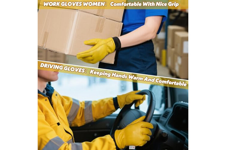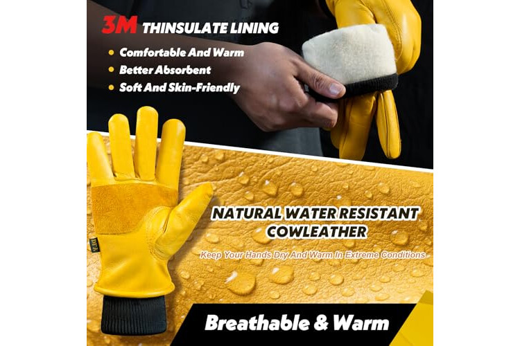 DLY Winter Work Gloves for Men, Insulated, Puncture and Abrasion Resistant, Cowhide Leather with Warm Thinsulate Lining for Cold Weather, X-Large, Yellow, New