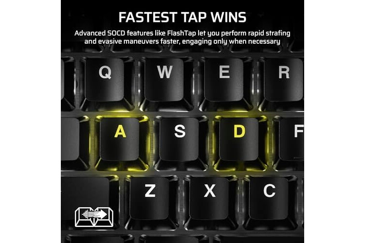 MGX Hyperdrive Magnetic Switches*: Pre-lubricated CORSAIR MGX Hyperdrive magnetic switches deliver a smooth, ultra-responsive keypress. Its sturdy double-rail structure reduces wobble and guarantees peak performance for 150 million keystrokes. *Function keys and non-primary keys feature CORSAIR MLX switches