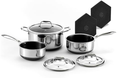 Be ready for all cooking occasions with our Hybrid 2-Quart, 3-Quart and 8-Quart set offer the ultimate in versatility in cooking when it comes to boiling, braising, steaming and simmering. Two of our HexClad Trivets are included to keep your counters protected.