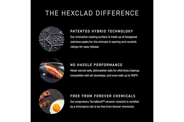 HexClad’s Hybrid technology features a laser-etched hexagonal nonstick surface that combines both stainless-steel and our TerraBond ceramic coating for the ultimate sear and easy cleaning.