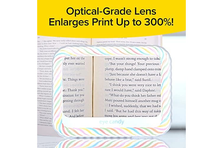 Enlarges Print Up to 300%: you’ll never miss a word or detail again! Eye Candy has an optical grade lens that enlarges print up to 300%. It’s perfect for reading the newspaper, a paperback, or even an article on your phone!