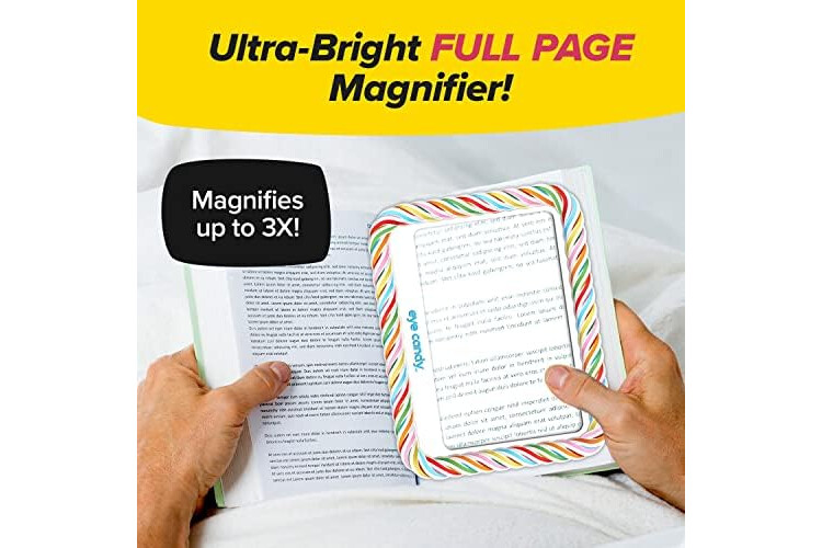Full-Page Magnifier: unlike other magnifiers that only enlarge a small portion of the page, Eye Candy is a full-page LED magnifier with an anti-glare screen that magnifies up to 3X so you can see bigger and brighter!