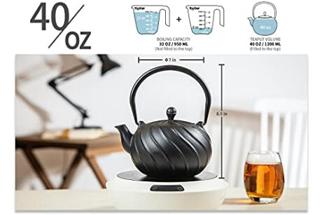 🌊 Big Tea Kettle But Looks Small - Tea Kettle FULL-LOAD CAPACITY: 40 oz / 1200 ml, RECOMMENDED BOILING CAPACITY: 34 oz / 1000 ml. The stovetop cast iron tea kettle allows gradual and even heating. It will help infuse the greatest amount of flavor from the tea leaves into the water. Cast iron teapot could break down the elements of Fe2+, which is beneficial to your body. Japanese cast iron teapot also has long heat preservation.