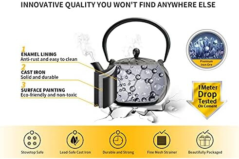 🌊 Teapot with Infuser - SERVE for 3-4 people, 5-6 mugs WHEN the tea kettle is FULL-LOADED. The stainless-steel infuser helps separate tea leaves from the water, which can be removed and cleaned easily. The material of the cast iron tea kettle is sturdy and protects the teapot from being damaged easily, which greatly extend the life of cast iron teapot. The fully enameled interior helps preserve the taste of the tea original and pure and allows for easy care.